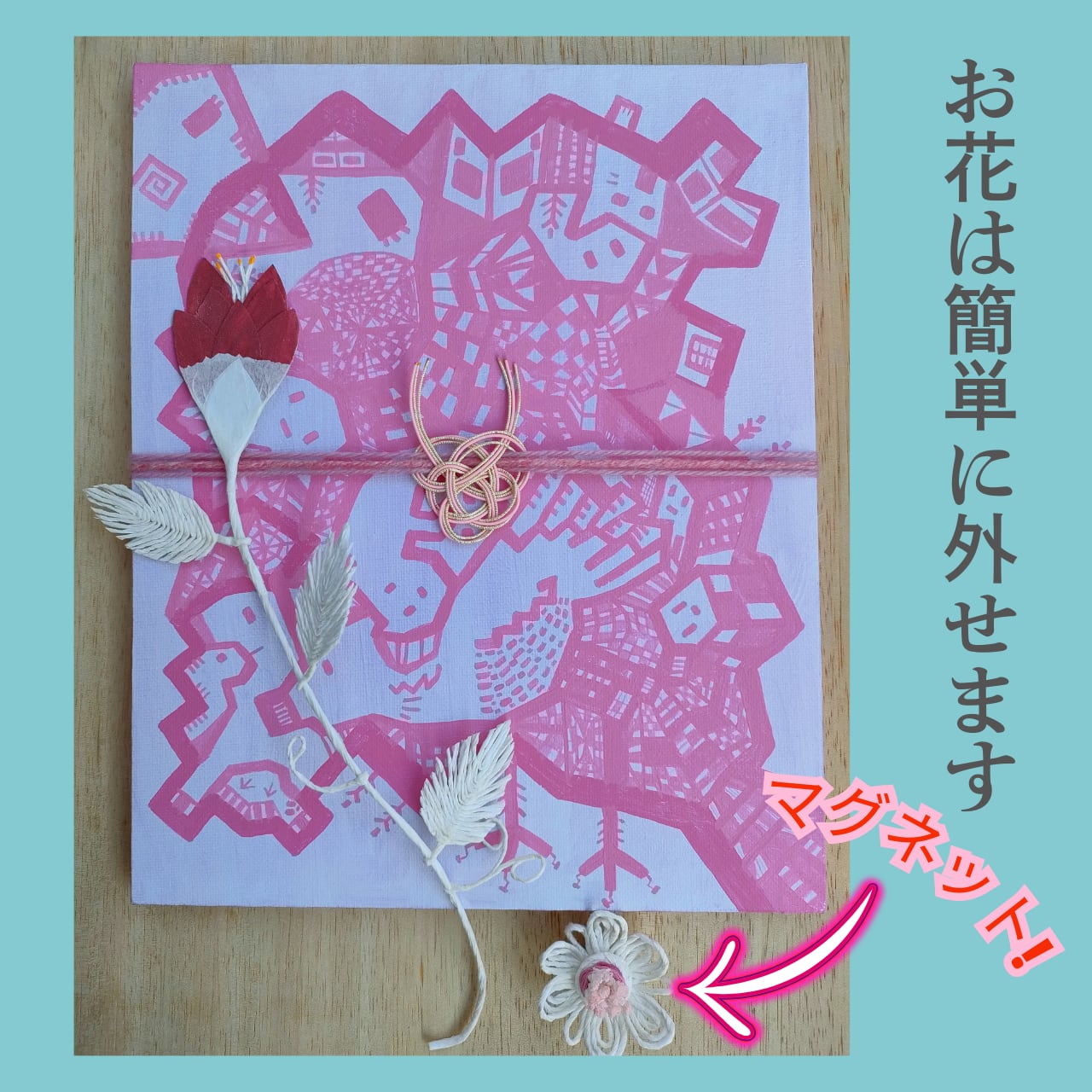 水引は長寿や健康、金運のシンボルとされる亀の子結びに!飾りのお花はマグネットなので簡単に外せ、キャンバス✕水引で飾ることもできますよ。