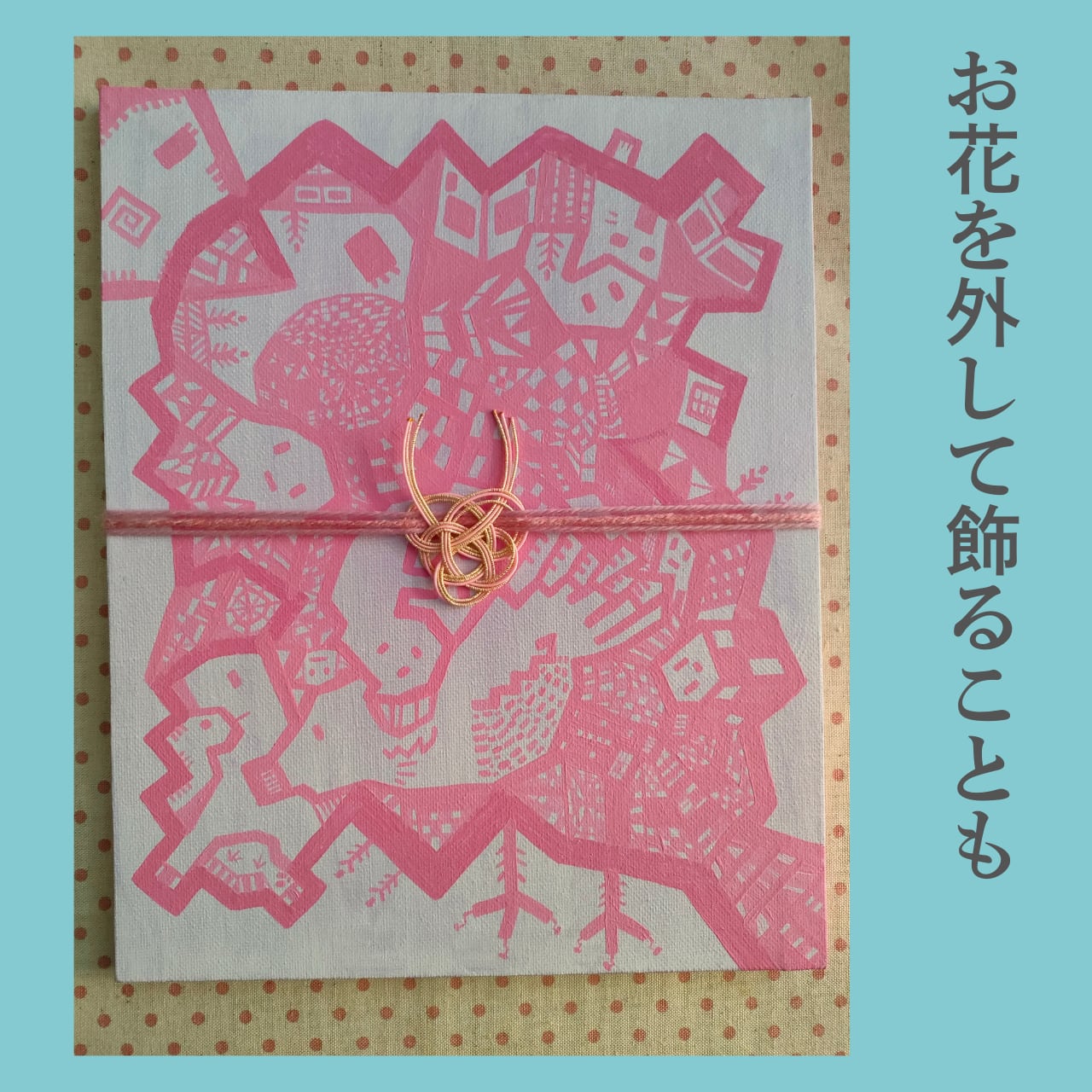 ピンクが基調の熨斗アートです。他の作品より少し大きめで、キャンバスF3〈縦273mm × 横220mm〉を使用。アクリル絵の具で細かく描いた、ユニークな作品です。