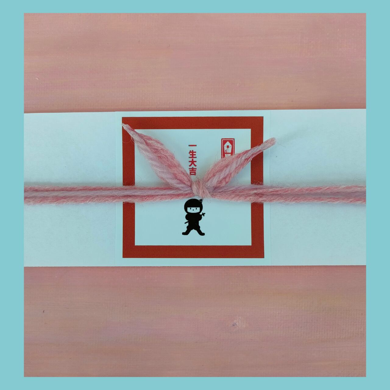 裏面中央に貼られているのは、オリジナルの『一生大吉』シールです。添えられたイラストの忍者くんは、ゆるりんの熨斗アートブランドのマスコットですよ(よろしくね!)