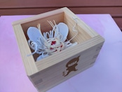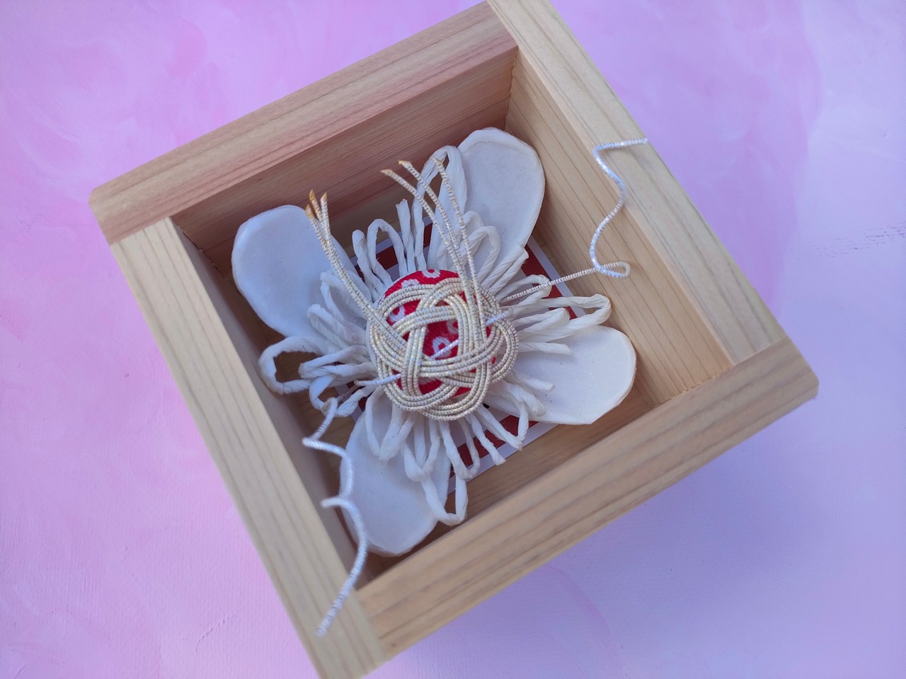 枡に添えたカミの花〈カミノハナ〉は、ゆるりんの手作りです。縁起の良い水引・梅結びも添えた、とてもおめでたい作品。